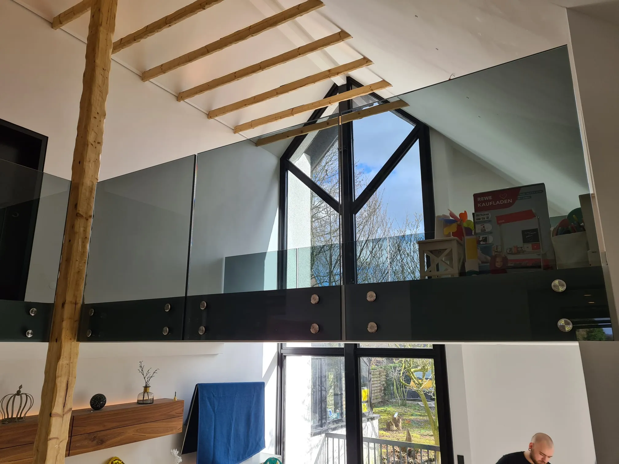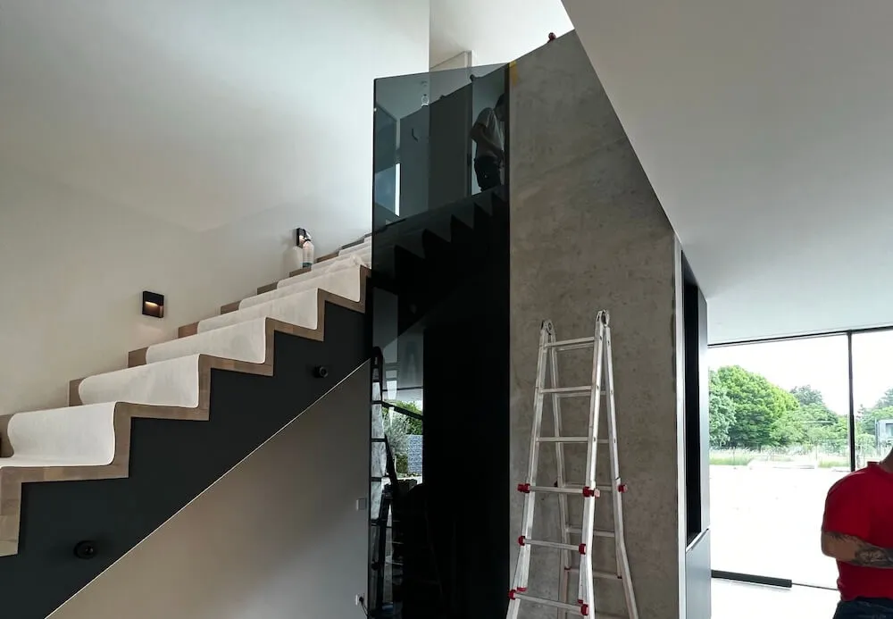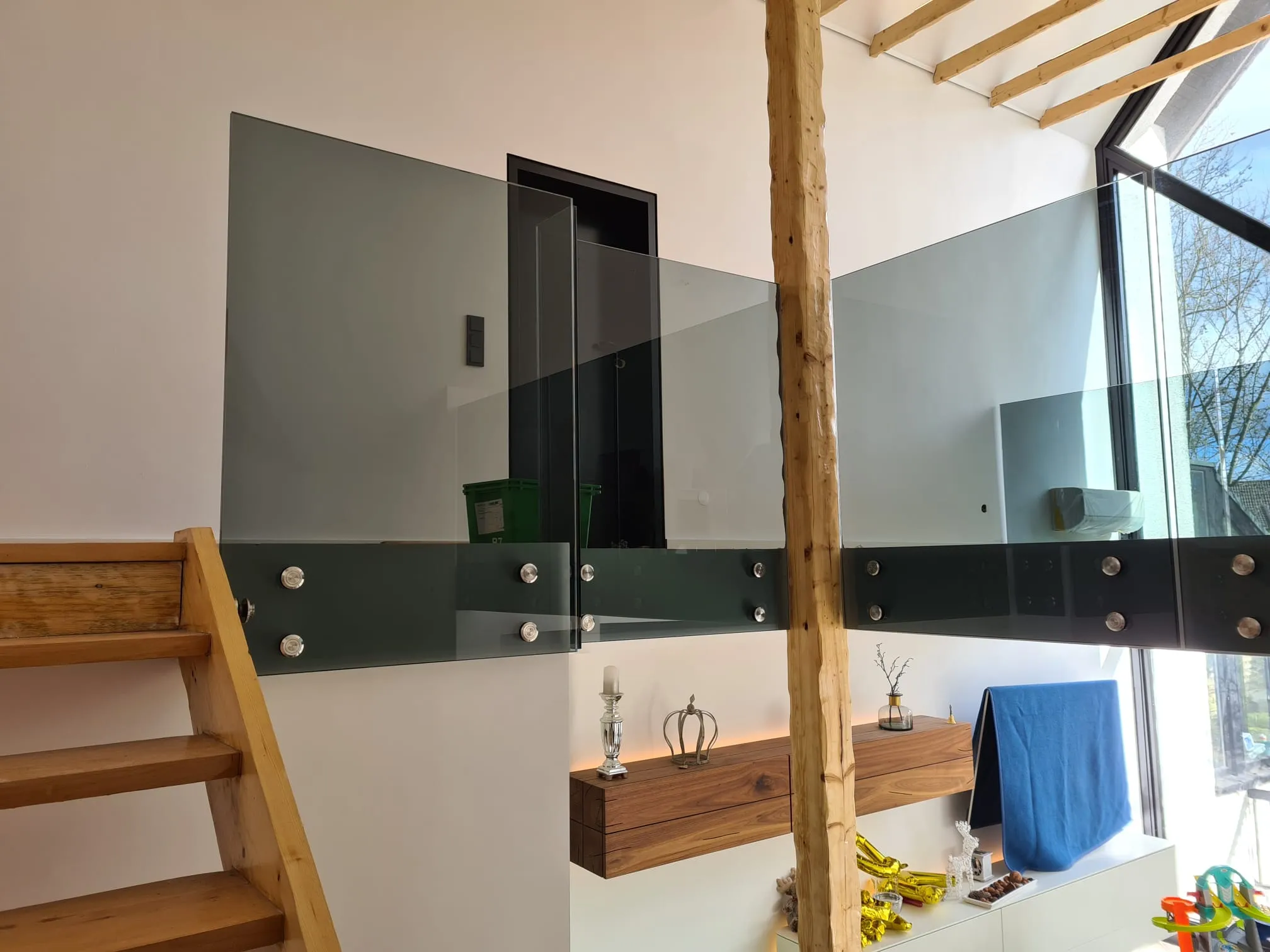 They deliver what they promise. In this case, 21.52 mm white glass with a total weight of 160 kg. The adjustable stainless steel point fixings were installed by our partner Glaserei Horn.