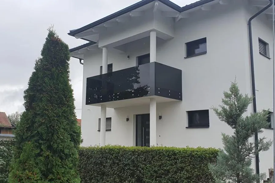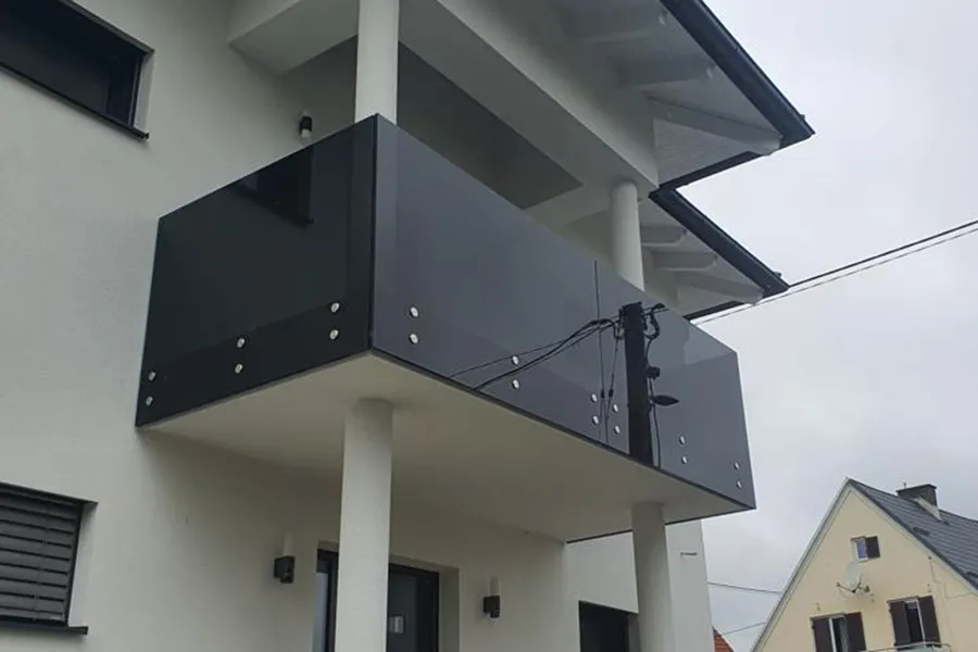 An anthracite-coloured glass balcony surround mounted by our partner Glaserei Meisl in Austria. The dicsreet point fixings are visually restrained and let the dark glass speak for itself.